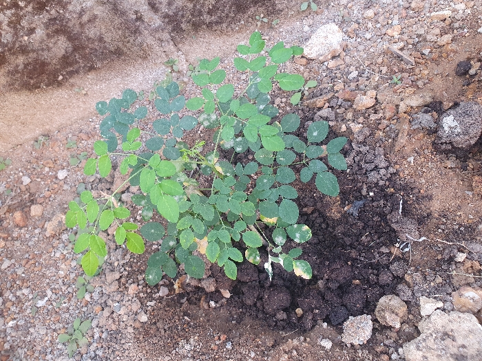This image depicts a solitary green plant, approximately 30-40 cm in diameter, rooted in disturbed earth within an outdoor environment in Jos, Nigeria. The plant features multiple stems supporting dense, compound leaves, some exhibiting minor chlorosis or small white spots. It is situated in a localized area of dark, rich soil, which contrasts with the surrounding ground composed predominantly of dry, reddish-brown soil mixed extensively with gravel and various-sized rocks. Sparse, unidentified green vegetation is visible among the rocky terrain. In the upper right quadrant, a light, sandy-colored surface, consistent with the base of a weathered concrete or stucco wall, is visible, displaying darker, irregular stains. The scene is illuminated by ambient daylight.