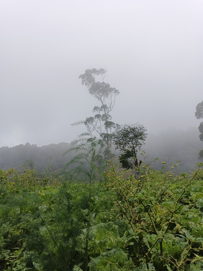 The image displays a misty, cultivated landscape located in Pinnwe, Myanmar (Burma). In the foreground, a field of verdant plants is visible, consisting primarily of large, broad-leafed green plants, consistent with a brassica type, many showing signs of minor insect damage on their leaves. Taller, slender plants with feathery green fronds, resembling asparagus, are interspersed throughout this vegetation. Additionally, bushes bearing small, light-green, elongated fruits, characteristic of chili peppers, are present. The mid-ground features a prominent, tall tree with sparse branching and foliage concentrated at its upper sections, partially obscured by the pervasive mist. A second, smaller tree with denser canopy is visible to its right. The background consists of forested hills and slopes progressively fading into a thick, uniform layer of grey fog or mist that merges with the overcast sky. No human figures, animals, or man-made structures are observed within the frame.