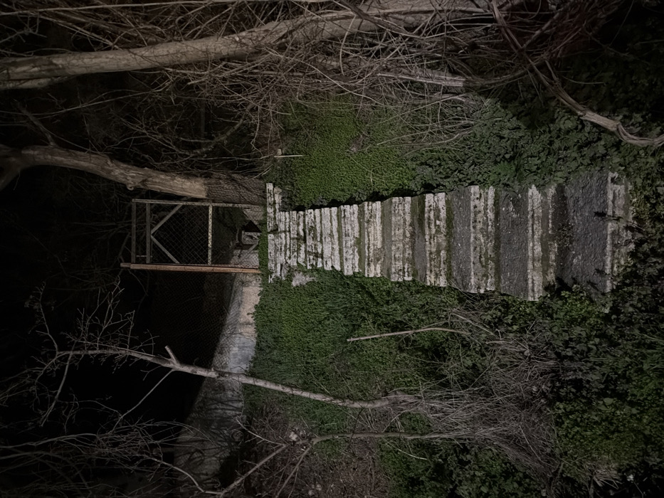 The image captures a nighttime outdoor scene in Balchik, Bulgaria, illuminated by an unseen light source. A weathered, straight concrete staircase, consisting of approximately 16-18 steps, ascends from the foreground towards the upper center. The steps exhibit moss and lichen growth, indicating dampness and age. Dense, low-lying green vegetation, primarily ground cover resembling ivy or similar creeper, flanks both sides of the staircase and covers the embankment it traverses. At the top of the staircase stands an unlit, rudimentary gate. The gate appears constructed from a wooden frame enclosing a section of metal mesh or wire. It is partially open or damaged, revealing a dark, obscured opening behind it. To the left of the gate, a lighter-colored wall or building facade is partially visible behind a chain-link fence. Bare, leafless deciduous trees and tangled shrubs with gnarled branches surround the staircase and gate, extending into the dark background on both sides. A larger tree trunk is prominent on the right, with a smaller, thinner tree on the left. The sky is black. No individuals, animals, or active subjects are present in the scene.