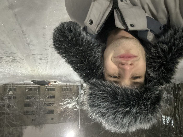 A person wearing a fur hat and winter coat is pictured against a snowy backdrop. A multi-story building is visible with snow-covered trees. A snow-covered path or road is adjacent to the building. The scene is illuminated by what appears to be a streetlight. The person looks directly at the camera with a slight smile. The image has been rotated, causing the landscape elements to appear above the person.