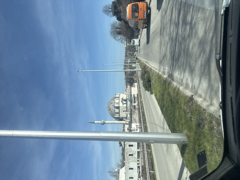 The image depicts an exterior view of the Sherif Halil Pasha Mosque, also known as the Tombul Mosque, located in Shumen, Bulgaria. The mosque, characterized by its large central dome and a slender minaret with a conical spire, is visible on the left side of the frame. It is constructed from light-colored stone and features multiple smaller domes and arched windows. To the immediate left of the mosque, a multi-story building with a light-colored facade and rectangular windows is under construction or in disrepair. In the foreground, the scene is observed from inside a vehicle, with a portion of the dashboard and windshield wipers visible at the bottom. A prominent tall, silver-colored pole, likely a streetlight or utility pole, occupies the left foreground, partially obscuring the mosque. A paved road stretches into the distance, with two visible lanes heading away from the viewer. A grassy median strip, featuring some low-lying green shrubbery, separates the road's directions. Numerous modern streetlights line both sides of the road. On the right side of the road, an orange Mercedes-Benz Sprinter van or minibus is parked or moving slowly in the rightmost lane. Further down the road, a white bus is visible. A single individual is discernible walking on the sidewalk or shoulder to the right of the white bus. The landscape on the far right includes a barren hillside covered with trees and brush, topped by a solitary, bare tree on an elevated rock formation. The sky is clear and blue with minimal cloud cover, and shadows indicate bright sunlight. Trees across the landscape are largely bare, suggesting a late winter or early spring season.