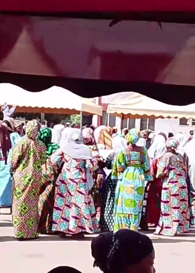 group of people, mostly women, gathered in an outdoor setting. Many of the women are wearing colorful, patterned dresses and headscarves. They appear to be standing or walking together, some moving to the right. Several white tents are visible in the background, along with a red structure. The camera appears to be positioned under a red canopy, with the edge of it visible at the top of the frame. The overall impression is of a gathering or event taking place outdoors.