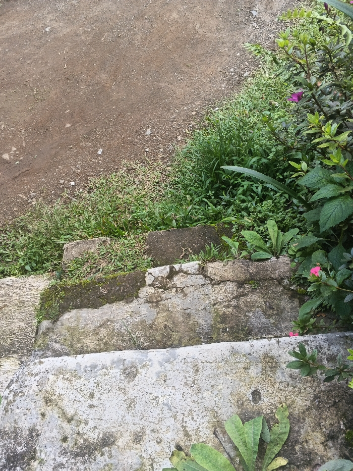 The image displays a downward-angled view of an outdoor environment in Kon Tum, Vietnam. Three visible concrete steps descend from the bottom of the frame towards an unpaved reddish-brown dirt path in the upper left. The lowest step is wide, light grey, and shows extensive dark grey and black biological growth and wear. The middle step is narrower, darker grey, and also exhibits staining and growth. The uppermost visible step is irregular in shape and partially obscured by grass. A low, textured concrete retaining structure, consistent with aging and biological staining, runs parallel to the steps on the right. Dense green vegetation, comprising grasses, weeds, and shrubs, borders the dirt path and flanks the steps and retaining structure. Several plants feature bright pink, five-petaled blossoms in the lower right, and a single purple blossom is visible higher up on the right side. No individuals, animals, or actions are depicted. The scene is illuminated by natural light, showing no harsh shadows.