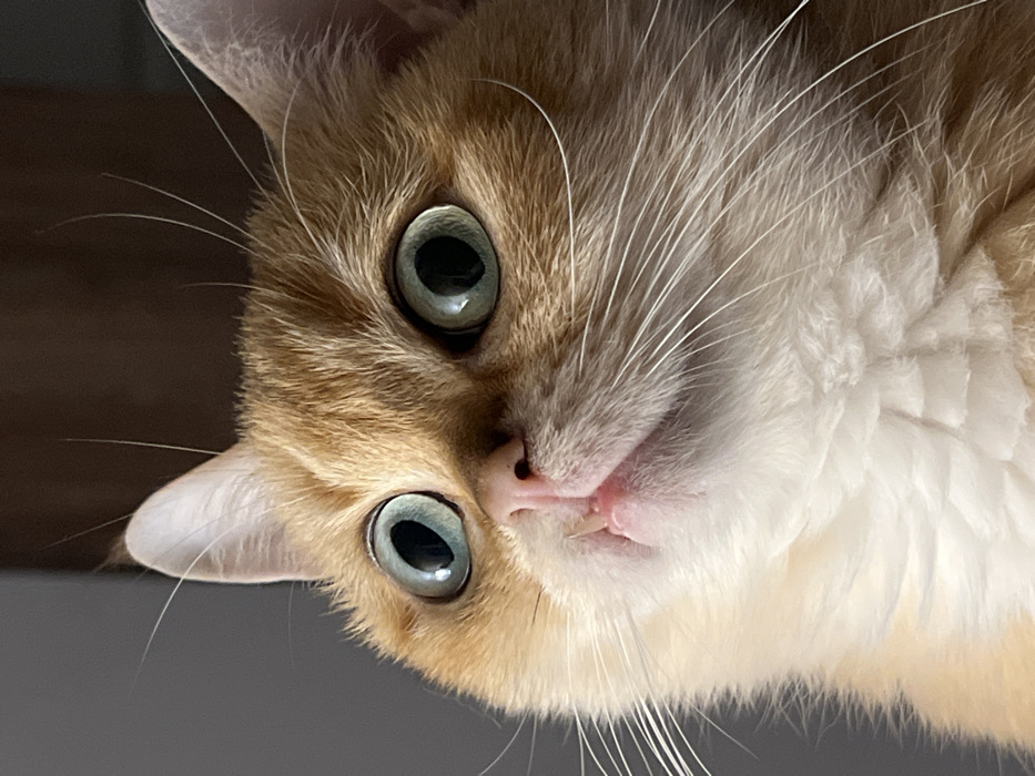 An upside-down close-up depicts a ginger and white cat with wide, captivating light green eyes
