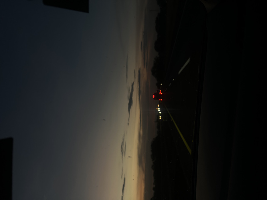 A dark highway at twilight stretches into the distance. Several red and white lights glow ahead, suggesting other vehicles. The sky transitions from a dark blue-gray to a pale orange near the horizon, dotted with wisps of clouds. Trees line the right side of the road, silhouetted against the faint light. A yellow line marks the road's edge. The image appears to have been taken from inside a vehicle.