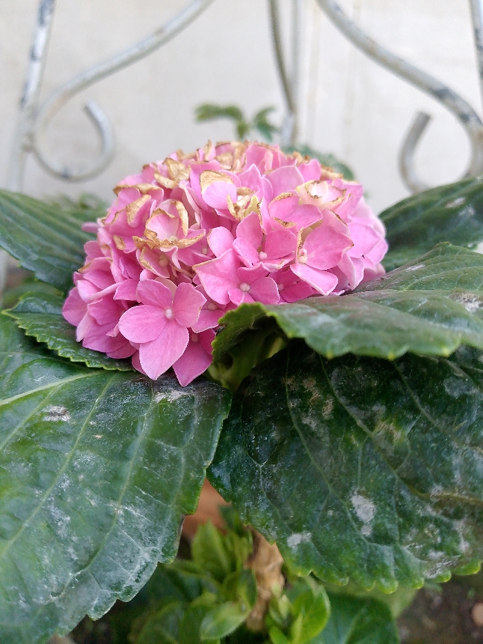 A close-up showcases a pink hydrangea with browning edges on some petals. The flower is nestled amidst large, green leaves, some of which appear dusty or marked with whitish spots. A portion of a white, wrought-iron fence is visible in the blurred background. A bit of greenery appears to be the stem.