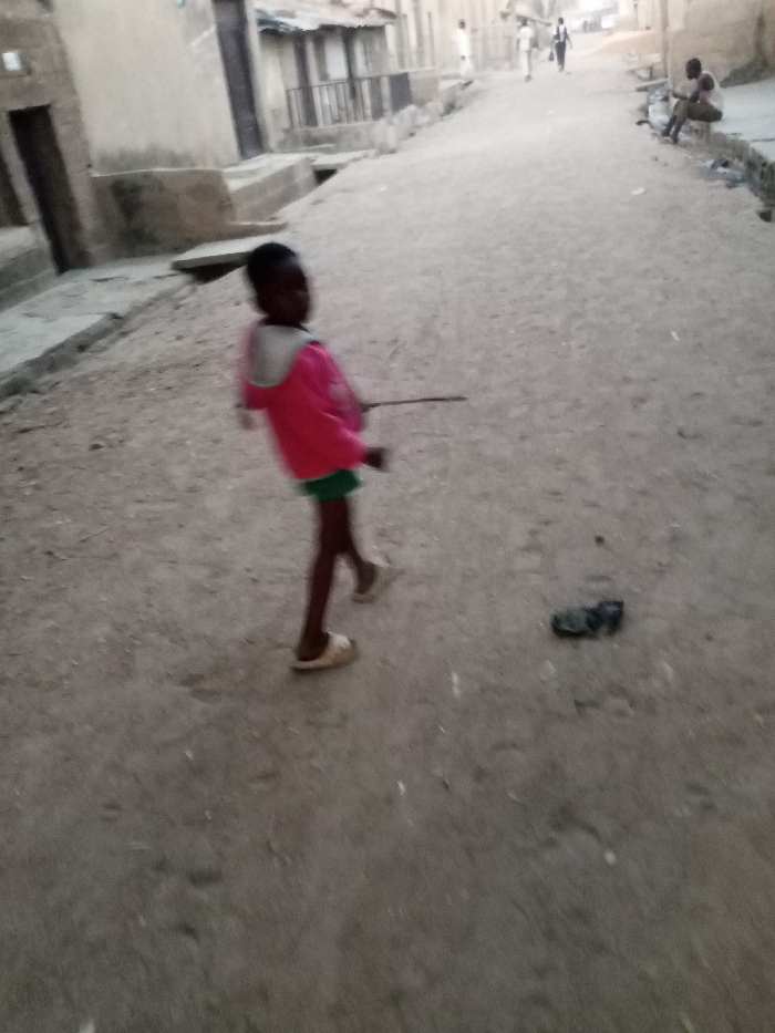 An outdoor scene in Gwagwarwa, Nigeria, depicts an unpaved, light-brown dirt road flanked by low, earth-toned buildings under diffused lighting. In the foreground, a dark-skinned child, blurred due to motion, walks from left to right, facing forward. The child wears a pink long-sleeved top with a lighter-colored hood or collar, green shorts, and light-colored sandals, holding a thin stick in their right hand. To the child's right, a pair of dark, possibly green, discarded flip-flops lies on the ground. Along the left side of the road, buildings feature simple doorways and low concrete foundations. On the right, a low concrete curb or wall runs parallel to the road. In the midground and background, additional figures are visible: one individual is seated on the curb on the right, while several other indistinct figures walk further down the road.