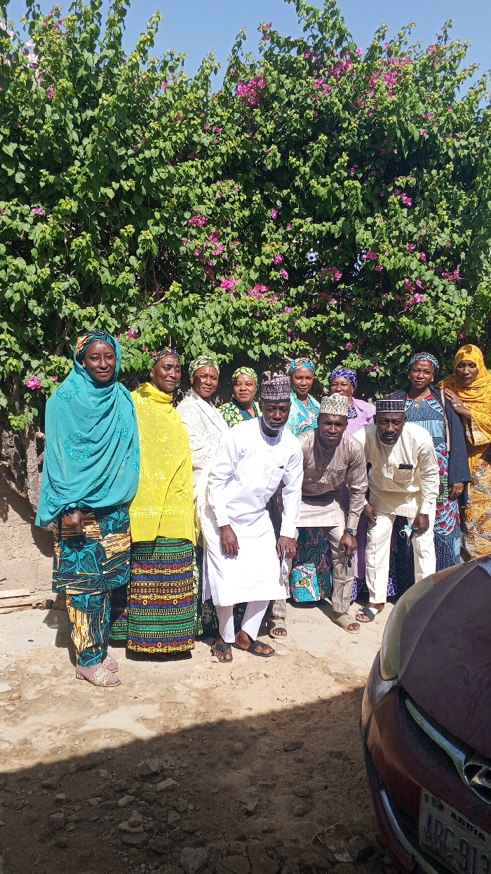 The image displays a group of eleven individuals—eight women and three men—posing outdoors in Abuja, Nigeria