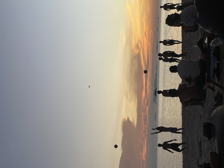 The image captures a sunset scene on a beach in Baan Sri Thanu, Thailand. The sky presents a gradient, transitioning from a light blue at the zenith to vivid orange and pink tones near the horizon, marked by scattered clouds. A small, dark aerial object, consistent with a drone, is visible in the upper central portion of the sky. The calm ocean water reflects the sky's colors, and distant landmasses are silhouetted against the horizon. On the sandy beach, several individuals are present. Towards the left and center-left, approximately six to seven male figures are engaged in a beach volleyball game. Two dark volleyballs are airborne: one positioned high above a player on the far left, and another further right, closer to the horizon. One player on the left is depicted mid-action, with arms extended upwards, indicative of a set or block. In the foreground and towards the center-right, additional individuals are seated on the sand, facing the ocean and the setting sun. These figures are primarily viewed from behind, appearing as dark silhouettes. Some are seated on what appear to be beach cushions or low chairs. Near these seated individuals, a low surface, possibly a small table, holds items including a plastic water bottle. The scene is strongly backlit by the sunset, resulting in prominent silhouettes of all subjects against the illuminated sky and water.