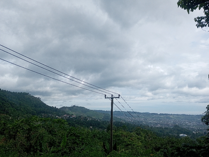 Lush, green hillsides frame a cityscape under a heavy, overcast sky. A wooden utility pole with wires cuts through the scene, connecting the foreground to the distant urban sprawl. Dense foliage fills the lower portion, giving way to the built environment further out. The cloudy sky dominates the upper half of the frame.