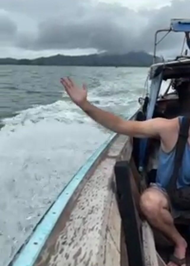 man on a boat. He's wearing a blue tank top and brown sandals. He has a striped bag slung over his shoulder. The man is reaching out with his right arm to touch the water rushing past the side of the boat. He's smiling. The boat appears to be made of wood. Behind the boat, in the distance, there are islands with a mountainous landscape. The sky is overcast.