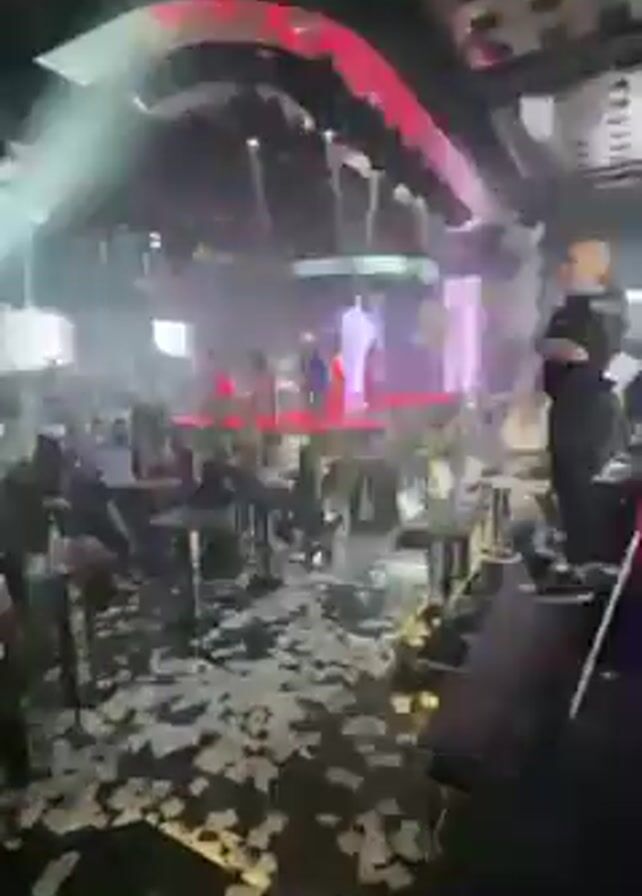 crowded nightclub with a performer on stage under bright spotlights. Confetti covers the floor, and the ceiling is decorated with red and white light structures. People stand around tables, watching the stage. The lighting changes colors, creating a dynamic atmosphere.