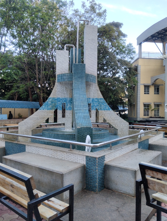 A tiered, geometric fountain dominates the scene, constructed with white and blue tiles
