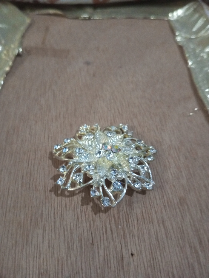A silver-toned metallic brooch, intricately designed in a multi-layered floral pattern, rests centered on a light brown wooden surface with visible vertical grain. The brooch is adorned with numerous clear, faceted rhinestones of varying sizes, with a prominent central stone displaying iridescent reflections. A distinct shadow is cast to the immediate right of the object. The background features blurred areas of shiny, yellowish-gold material along the top and right edges of the frame. No individuals are present, and no actions or interactions are depicted. The scene is static, located in Chandragiri, Nepal.