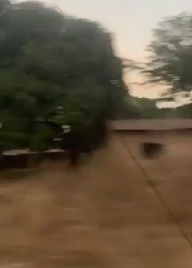 view from a moving vehicle, likely a car, traveling through a rural area. The landscape consists of dirt roads, simple buildings with satellite dishes, and trees, including palm trees. The sky appears to be at dusk or dawn, with a muted color palette. The camera is moving, causing motion blur in the video.