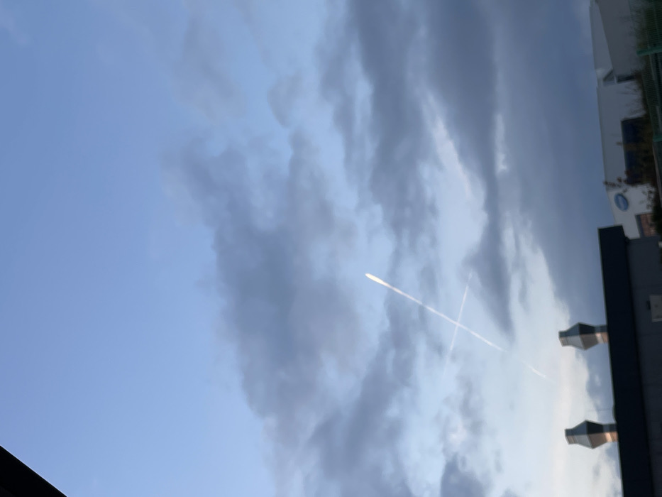 The image depicts an outdoor scene in Nuremberg, Germany, specifically at or near the Nuremberg Exhibition Centre (Messe Nürnberg). The sky occupies the majority of the frame, showing a light blue background mixed with various grey clouds. Two prominent white contrails intersect in the upper-mid sky, forming an "X" shape; the contrail descending from upper-right to lower-left is brighter and more distinct. In the lower left of the image, the top of a dark-colored, flat-roofed building is visible, featuring two large, metallic, conical ventilation ducts with flared tops. To the right, a segment of a modern, light-colored building, identifiable as part of the Messe Nürnberg, is present with a partially obscured circular blue logo on its facade that includes the word "NÜRNBERG." A low green fence or vegetation line is visible in front of this building. No people are visible. The lighting is diffuse, indicative of an overcast day or twilight conditions.