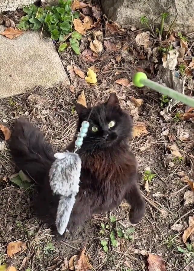 black, long-haired cat outdoors, in a yard covered with leaves, dirt, and some small plants. The cat stands on its hind legs, its front paws raised, looking up at something out of frame. The camera briefly focuses on a cat toy made of blue beads and a white fluffy ball, lying on the ground amidst the leaves. The cat then moves towards the toy, its bushy tail following. The background includes a rock wall and a stone paver.