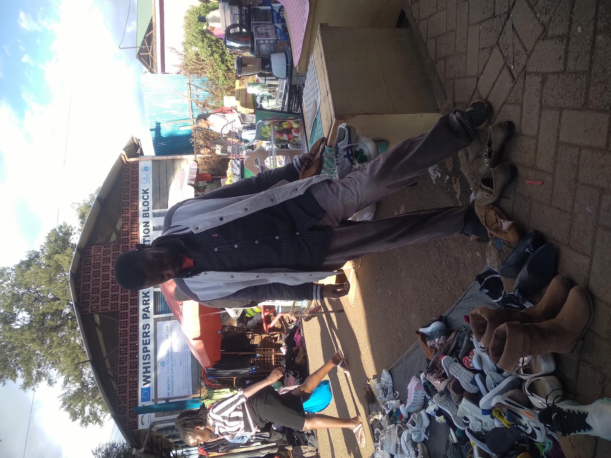The image captures an outdoor scene in what appears to be a market or informal trading area. A man is standing with his legs spread apart, seemingly presiding over or interacting with the display of shoes laid out on the ground. These shoes are of various types and colors, possibly for sale. A woman is bending or crouching near the shoes, possibly looking at them or making a purchase. Behind them is a structure with a sign that reads "WHISPERS PARK," "ERI WATER AND SANITA," and "TION BLOCK." This suggests the location might be near a park or a water and sanitation facility, potentially within a town or city. The sign also mentions "german" and a company name, "AILYONS," indicating possible connections to German entities or products. The ground is paved, and there are other goods or merchandise visible in the background.