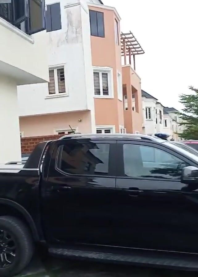 The video presents a series of outdoor shots in what appears to be a residential area. The initial shot focuses on a black pickup truck parked adjacent to a building with light-colored walls and dark-framed windows. The camera pans to the right, revealing other vehicles, including a red car further down the street. The setting comprises multiple houses, each varying in design but generally featuring light-colored exteriors. The street is paved with grey brick and lined with trimmed greenery, adding to the structured appearance of the neighborhood. The sky is overcast, providing diffused lighting over the scene.