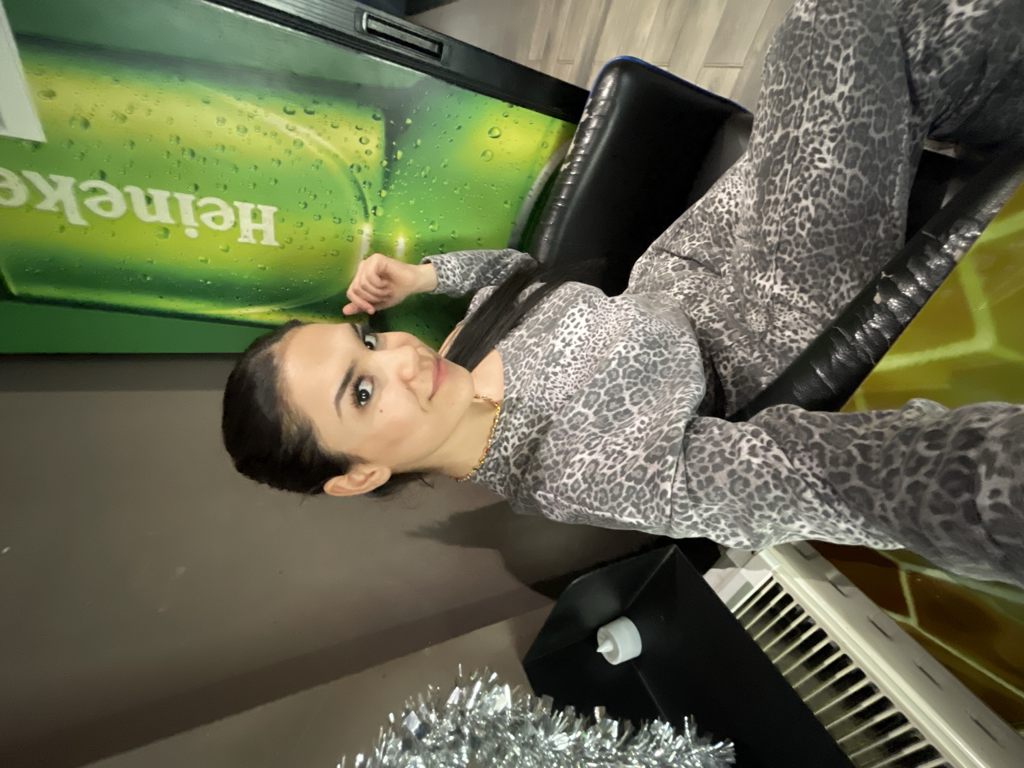 The scene depicts an indoor setting, identified as being in Berlin, Germany. A young adult female is seated in a black, padded armchair, facing the camera with a slight smile. She has dark hair styled away from her face and is wearing a grey and black leopard print long-sleeved top and matching pants, possibly a loungewear set or jumpsuit. A gold-colored necklace with small colorful beads is visible around her neck. Her right hand is raised, with fingers positioned near her right temple. To the subject's right, a large, illuminated green Heineken beverage dispenser is prominent, featuring a graphic of a condensed Heineken can and the brand's vertical logo. To her left, against a dark grey wall, is a black triangular-shaped object or shelf. On this shelf, a white flameless LED candle is present next to a pile of silver tinsel. Below this shelf, a white object with visible black keys, resembling a miniature piano or electronic keyboard, is partially observable. The floor appears to be a light-colored, possibly tiled or wood-plank surface. The overall environment suggests a casual bar, lounge, or entertainment venue.