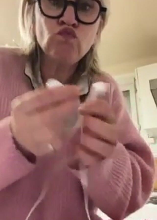 A woman with short, graying blonde hair and glasses puts in white, wired earbuds. She is wearing a pink sweater over a pajama top with black trim. She pursing her lips while looking at the camera. In the background is a white kitchen cabinet, and a red mesh bag with fruit is visible in the lower portion of the shot.