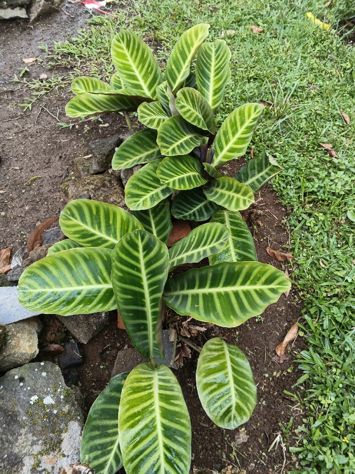 - "The image displays an overhead view of a *Calathea zebrina* plant, or similar species, growing in a garden setting" by FM-1Rqoh1, licensed under CC BY 4.0