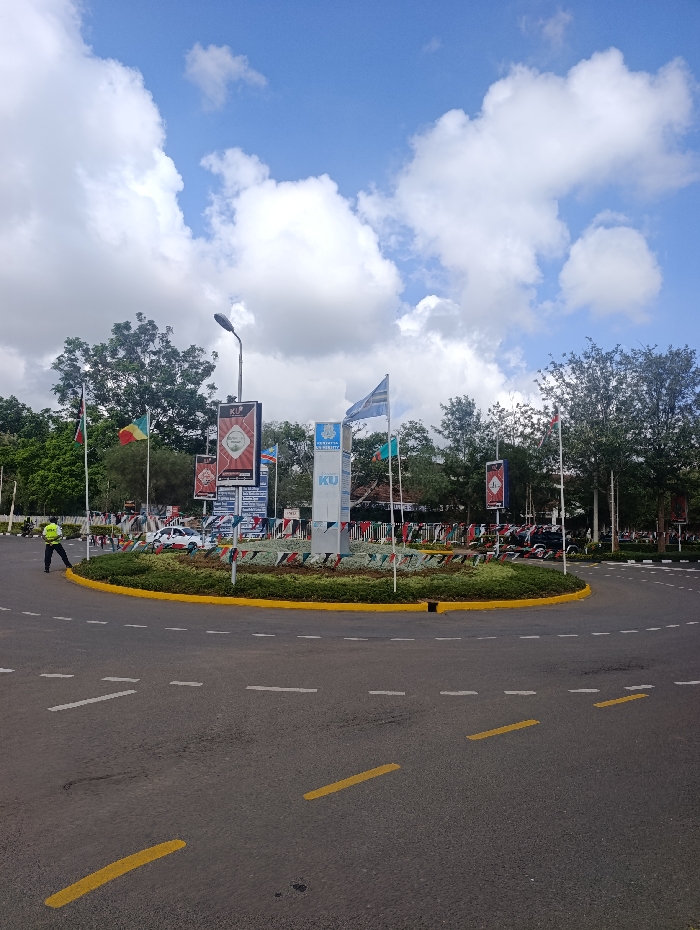 A roundabout features a central island with flags and signs. The road surface shows yellow lane markings. A person in a safety vest stands near the edge of the circle. Trees and buildings form the backdrop under a sky filled with white, puffy clouds.