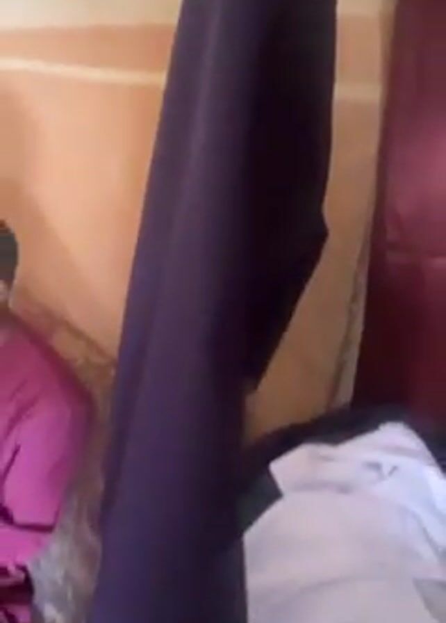 person holding up a dark purple garment. The garment has detailed brown trim on the sleeve. A white shirt is visible underneath it. A peach-colored wall and burgundy curtain are in the background. The camera moves slightly as the garment is held up.