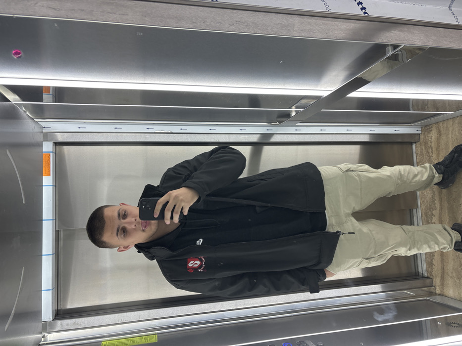 A young adult male stands inside an elevator, appearing to take a mirror selfie with his smartphone
