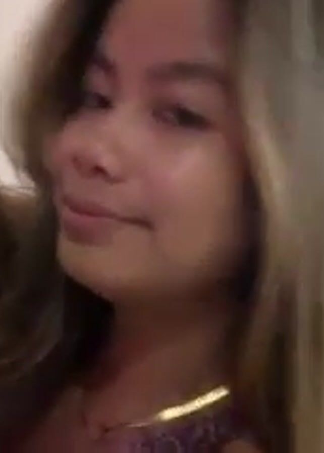 A young woman with long, light brown hair and light skin is lying down and looking at the camera. She is wearing a dark top with a floral pattern. The background is a plain white wall. The video is slightly shaky.