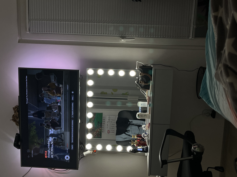 The image depicts an interior room, likely a bedroom, with dim ambient lighting supplemented by artificial sources. A large flat-screen television is mounted on a light-colored wall, displaying content from Netflix. The program visible is "Through My Window 2: Across the Sea," showing a scene with multiple young individuals in an outdoor setting. The TV screen indicates a playback time of 07:46 out of 1:43:07, with English and Spanish language options selected. Purple LED backlighting illuminates the wall around the television. A decorative golden motorcycle model rests on the wall above the television. Below the television, a white floating vanity table is positioned, topped with a large rectangular mirror. The mirror features a border of circular LED bulbs, all illuminated. Reflected in the mirror are a black office chair and a partial view of a person wearing a light blue denim garment. Also visible in the reflection, attached to the wall behind the vanity, is a calendar or poster featuring a floral image and text in Cyrillic script, including "2023," confirming the location as Sofia, Bulgaria. The vanity table's surface holds several objects: a dark blue perfume bottle, two reddish-gold perfume bottles, small white decorative items, a white bottle (identified as "Dove"), another small container, and a dark-colored structured handbag with a light-colored handle. A power cable runs from the vanity area downwards. To the right of the vanity, a white window frame is visible, with closed horizontal blinds. In the lower left foreground, a portion of the black office chair with armrests and wheels is visible. In the lower right, part of a bed is visible, covered by a blue and white patterned duvet and a grey blanket with a white star pattern. A dark waste bin is situated on the floor beneath the vanity table.