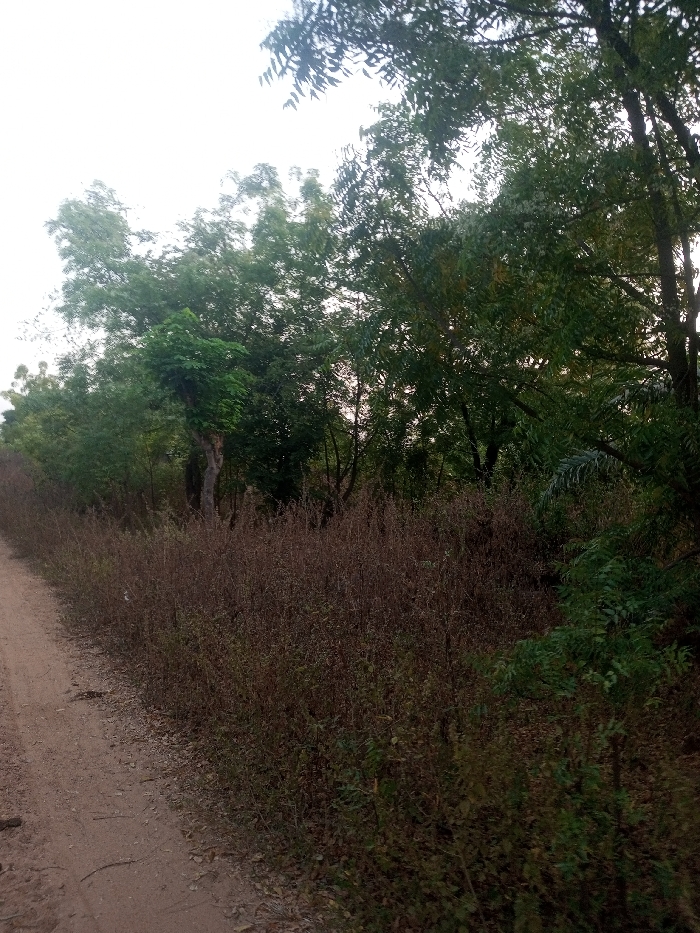 A dirt path borders dense vegetation transitioning from dried brown brush to lush green trees. The foliage forms a wall-like barrier alongside the path. Trees of varying heights and shades of green rise behind the brush, their branches and leaves intermingling. The sky is overcast, providing soft, diffused light across the scene.