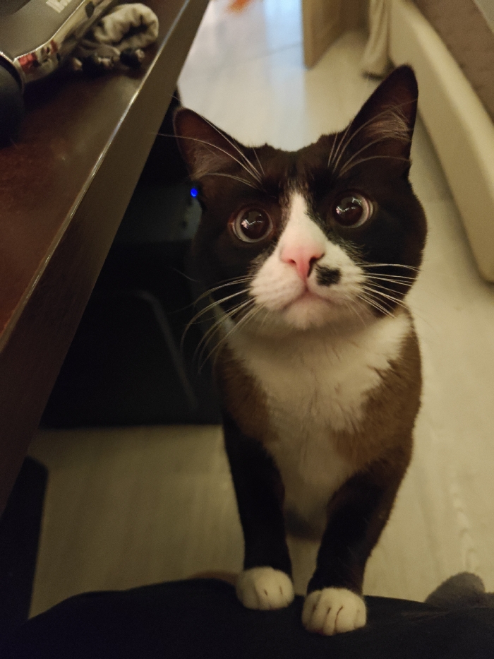 - "A charming tuxedo cat with brown fur and a white bib stands on its hind legs, its white paws resting on what appears to be a dark surface" by FM-eMutn2, licensed under CC BY 4.0