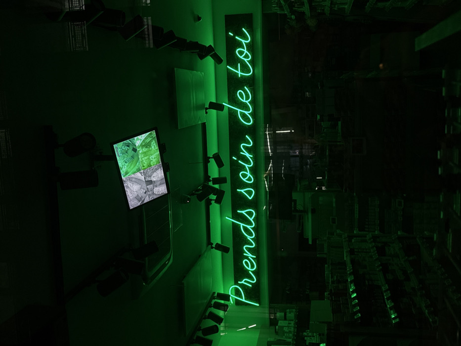 A surveillance-themed art installation featuring a monitor displaying four security camera feeds. Multiple dark security cameras point towards the viewer and the environment. A vertical neon sign reads "Prends soin de toi" (Take care of yourself) in bright green. The surrounding area is dark and features green lighting, including some blurred architectural elements or shelves, suggesting a warehouse or industrial setting reflected in the glass.
