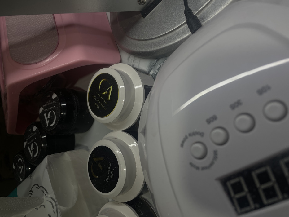 This image, taken in Aratashen, Armenia, presents a detailed overhead view of nail care products and equipment arranged on a surface, likely a countertop with a marble-like pattern