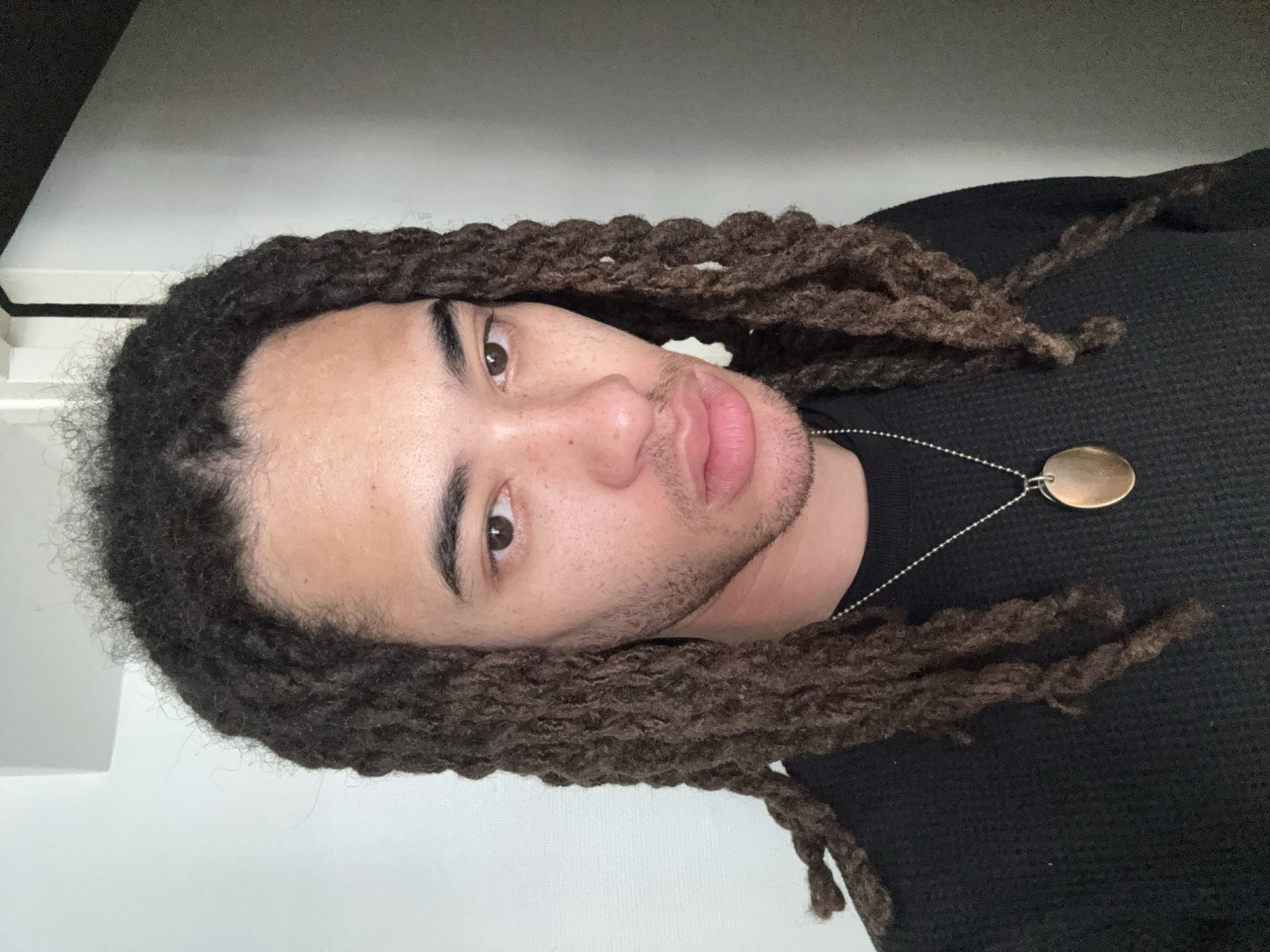 The image features a single individual, an adult male, centered and looking directly into the camera. He has light brown skin, dark brown dreadlocks, and dark brown eyes. Sparse facial hair is present on his upper lip and chin. He is wearing a black long-sleeved waffle-knit shirt. A silver-colored ball chain necklace with a smooth, oval, copper-toned pendant hangs around his neck. The background consists of a plain, light-colored wall on the left, transitioning to a darker gray wall or partition on the right. A white door frame or trim is visible in the upper right portion of the background. The scene is indoors, and no identifying architectural or environmental elements are present to determine a specific city, including Paris, France.