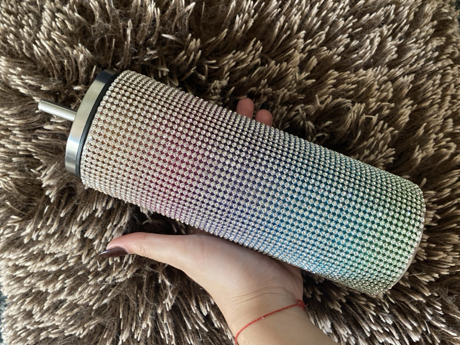 A bejeweled tumbler rests in a hand. The tumbler, adorned with iridescent rhinestones creating a rainbow effect, has a silver straw and lid. The hand has manicured fingernails with dark nail polish and a red string bracelet. The backdrop is a fluffy, brown, textured rug.