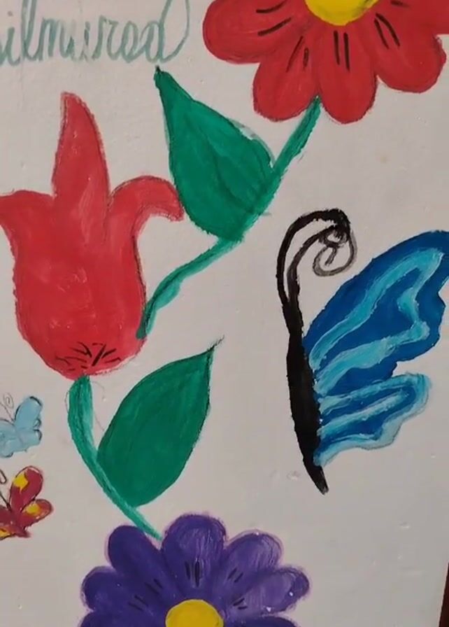 close-up of a painting on a white wall. The painting includes various flowers in red, purple, and blue hues, along with green leaves and a butterfly with blue wings and a black body. The painting appears to be amateurish, possibly done by a child, and includes the names "Dilmurod" and "LOLA" written on the wall near the flowers.