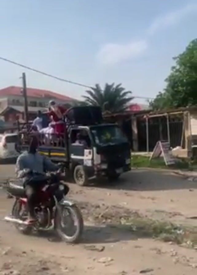 A dark-colored truck is driving down a dirt road. In the back of the truck are about 6 people. One person is dressed as Santa Claus. They are standing and gesturing as the truck drives by. A large speaker is also in the back of the truck. A motorcycle passes in front of the truck. There are a few buildings and trees visible in the background. The sky is blue.