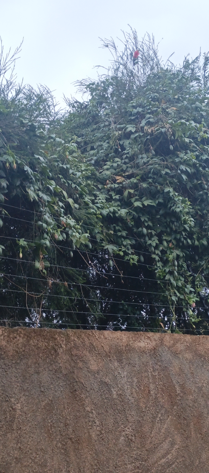 A textured brown wall forms the base of the image, topped by a wired fence. Lush greenery engulfs the fence, displaying a variety of leaf types and hanging fruit. A dense thicket of branches and leaves obscures the background. A vibrant red flower punctuates the scene atop the foliage, adding a splash of color against the overcast sky.