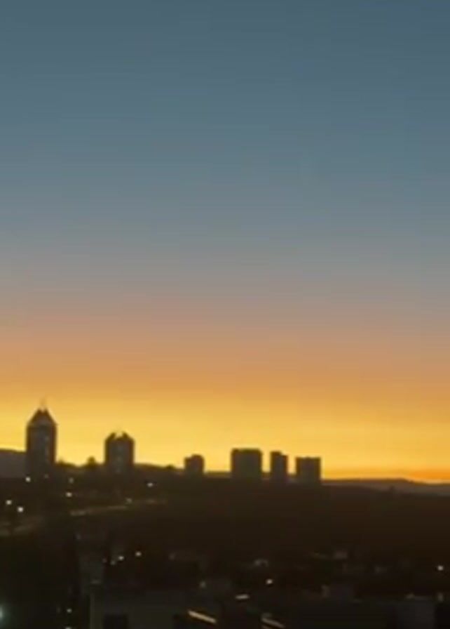 The video pans from a cityscape at sunset to a wider view of the horizon