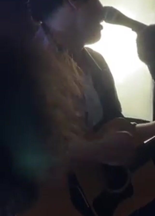 A man is singing into a microphone while playing an acoustic guitar. He's wearing a white t-shirt underneath a blue and grey plaid shirt. The lighting is uneven, with a bright white light directly behind him. The camera is mostly stationary, but moves slightly. A woman's hair is briefly visible in the left side of the frame, and another person is partially visible to the left of the musician. The room appears to be a recording studio. The man is wearing sunglasses on his head.
