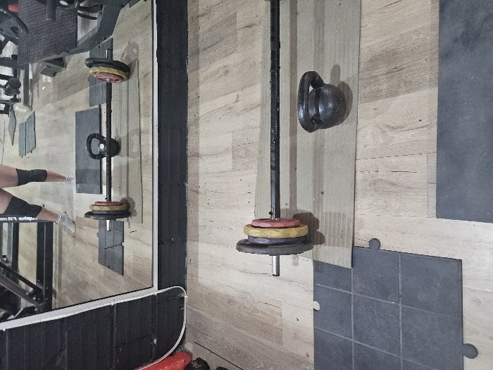 The image displays an indoor fitness facility located in Perímetro Urbano Cúcuta, Colombia. The floor features light-colored wooden planks, with sections of black interlocking rubber mats. A large mirror occupies the upper portion of the frame, reflecting the lower body of an individual wearing white socks, black knee sleeves, and light-colored shorts, standing with their back partially to the viewer. In the foreground, a black barbell is positioned horizontally on two light-toned wooden planks. The barbell is loaded with weight plates: yellow, purple, and red on its left end, and yellow, red, and a darker red or orange plate on its right end. A black kettlebell rests on the wooden planks near the center of the barbell. The mirror's reflection also shows parts of other gym equipment in the background.