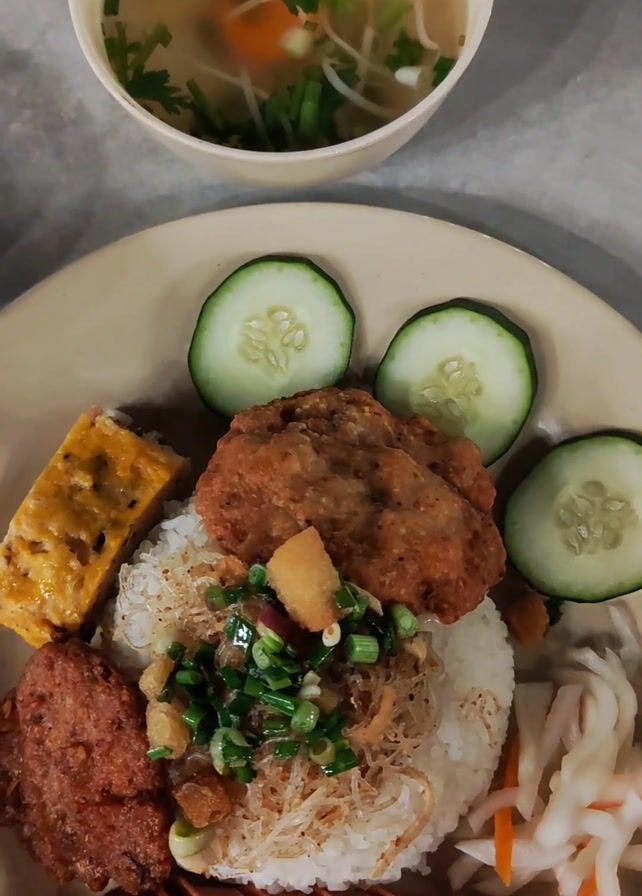 The video displays a plate of Vietnamese cơm tấm, or broken rice, with a small bowl of soup in the background