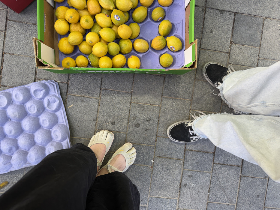 An overhead view captures a paved outdoor area, likely a market or street in Tel-Aviv, Israel. The ground is composed of grey rectangular paver stones. In the upper left, the lower legs and feet of an individual wearing loose black pants and off-white, five-toed minimalist shoes are visible. To their right, an empty, light purple, molded fiber or plastic tray, approximately 2x3 feet, rests flat on the pavement. To the right side of the image, an open cardboard box, green on its exterior with a brown interior, contains a purple molded insert holding approximately 50-60 lemons. The lemons are predominantly yellow, with some exhibiting a greenish tint. Several lemons display small white stickers. In the lower center, the lower legs and feet of a second individual are visible. This person wears light-wash denim jeans with frayed cuffs and black-and-white checkered slip-on sneakers. Both individuals are standing on the paved surface, positioned near the produce box and empty tray. The specific street or exact location within Tel-Aviv is not discernible from the visual evidence.