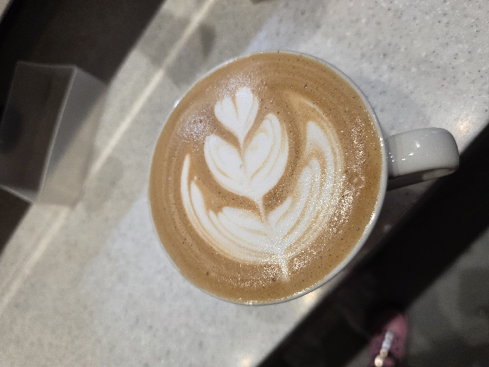 - "The image displays a close-up, overhead view of a white ceramic coffee cup containing a light brown beverage topped with white foamed milk latte art" by FM-ainSZ2, licensed under CC BY 4.0