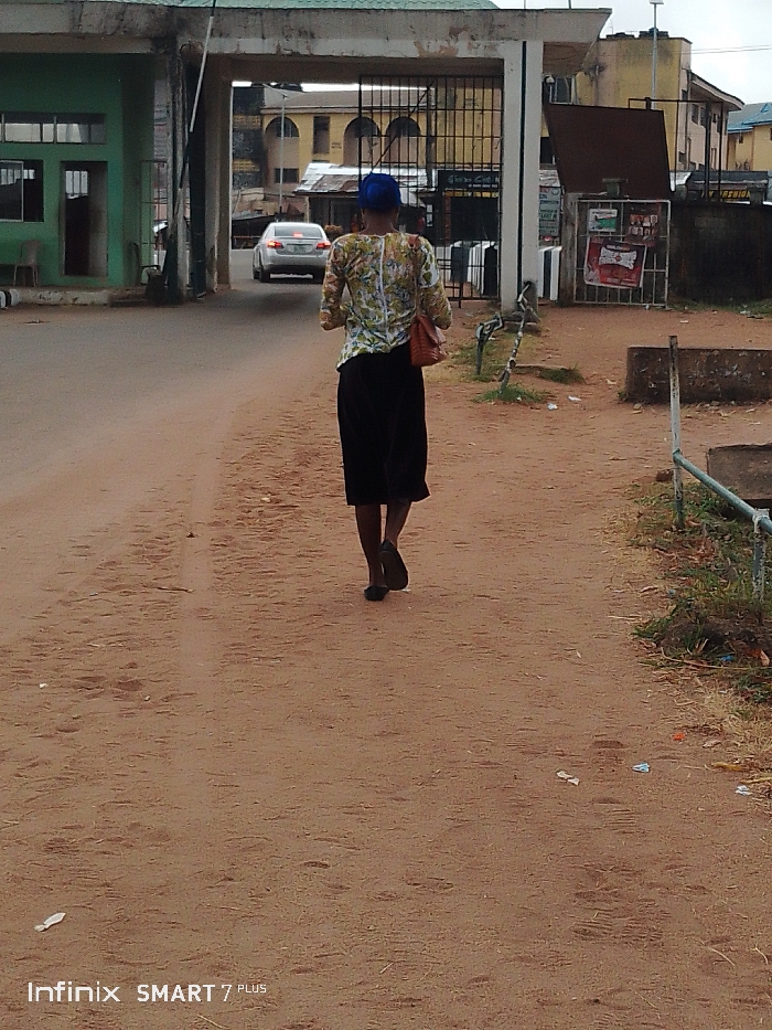 A woman with a blue head covering is walking away from the camera on a dirt road. She is wearing a patterned blouse, black skirt, and carrying a brown purse. A car is driving through a large gate in the background. Buildings and signs are visible through the gate and on the side. The ground is brown and textured, and there is sparse vegetation and a metal railing. The scene appears to be taken in a town or city environment.