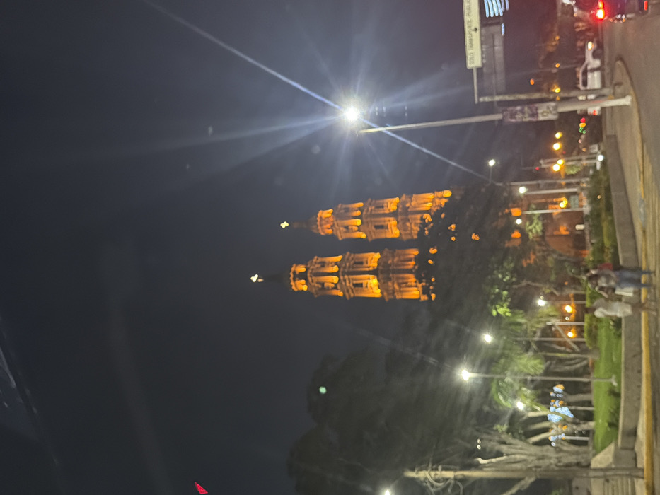 At night, a brightly illuminated cathedral with two prominent towers is reflected on a wet surface. Streetlights line a park area in front, with some people walking by. A street sign is visible, and cars can be seen further down the street. The scene is heavily lit, with reflections creating a symmetrical effect.