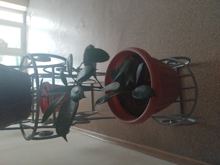 A plant in a terracotta pot sits inside a decorative metal plant stand. Another dark-colored pot is partially visible in the stand. The plant has thick, oval-shaped green leaves. The stand features circular and curved metal designs. A window is visible in the background, letting in bright light. The wall behind the plant has a textured, neutral color. The scene is shot at an angle.