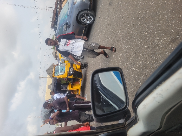 The image captures an outdoor street scene under an overcast sky in Unknown, Unknown. The perspective is from inside a vehicle, with a black side mirror and part of a white vehicle body visible in the lower-left foreground. The asphalt road, grey with white specks, occupies the lower and central portions of the frame. In the mid-ground, a young man with a dark complexion, wearing a white polo shirt with black sleeves and red stripes, grey cargo shorts, and black flip-flops, walks towards the left, looking forward. He wears a necklace and a bracelet. To his left, a bright yellow three-wheeled Keke-Napep (tricycle) with a black soft top is present, appearing stationary or in slow movement. A person in a green shirt is visible inside the Keke. A dark grey SUV, possibly a Lexus, is positioned to the right of the yellow vehicle, facing towards the right side of the frame. On the left side, a group of individuals is walking. One man, wearing a dark polo shirt and dark pants, carries a large grey bundle on his head. Another man, similarly dressed, walks beside him, making a gesture with his right hand. A person in a red tank top is partially visible on the far left. Other individuals are indistinctly visible near the yellow tricycle. The background on the left features low-rise structures with light-colored walls and dark roofs. Overhead utility lines crisscross the cloudy sky. On the far right, behind the SUV, a dark, stacked structure, possibly lumber or goods, is partially visible. No specific interactions are clearly depicted, but the scene indicates a busy area with pedestrian and vehicular traffic.